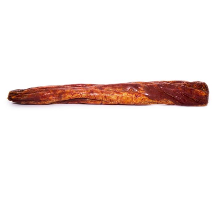 Se adoba con pimentón, ajo y sal, y se somete a una lenta curación en bodega que le confiere un sabor intenso y una textura muy jugosa.