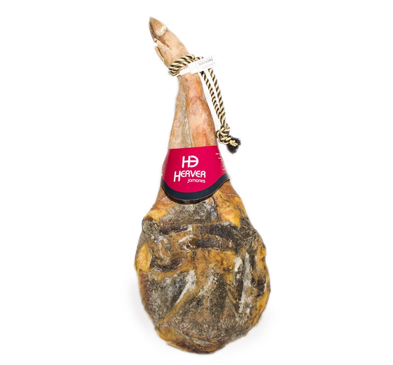 Forma alargada y redondeada, con un especial color rojizo y su grasa veteada brillante al corte. Conserva la pata.